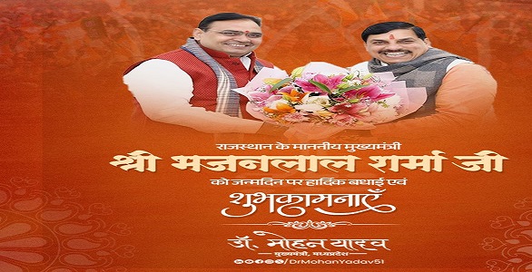 डॉ. मोहन यादव ने अपने संदेश में कहा कि मुख्यमंत्री भजनलाल शर्मा जनहित के मुद्दों को प्राथमिकता देते हुए संवेदनशीलता और दृढ़ संकल्प के साथ कार्य कर रहे हैं। उनके नेतृत्व में राजस्थान में विकास की गति तेज हुई है और आमजन के जीवन स्तर को बेहतर बनाने के लिए अनेक प्रभावी योजनाएं लागू की जा रही हैं। मुख्यमंत्री डॉ. यादव ने विश्वास जताया कि श्री शर्मा के दूरदर्शी नेतृत्व में राजस्थान आने वाले समय में आर्थिक, सामाजिक और सांस्कृतिक दृष्टि से और अधिक सशक्त राज्य के रूप में उभरेगा।