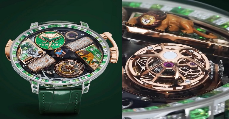 डिजाइन को जंगल से प्रेरित लुक देने के लिए इसमें ग्रीन कैमुफ्लाज मोटिफ का उपयोग किया गया है। घड़ी में कुल 397 कीमती रत्न जड़े गए हैं, जिनका कुल वजन लगभग 21.98 कैरेट है। इनमें डिमेंटोइड गार्नेट, सावोराइट्स, हरे रंग के नीलम और सफेद हीरे शामिल हैं। इन रत्नों की बारीक सजावट घड़ी को एक विशिष्ट और बेहद प्रीमियम पहचान देती है।
