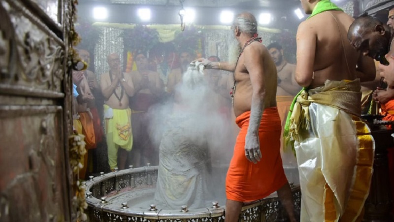 आज की भस्म आरती विशेष थी क्योंकि बाबा महाकाल के मस्तक पर चंदन का त्रिपुंड और भांग से त्रिनेत्र बनाया गया, साथ ही त्रिशूल अर्पित कर उनका मनमोहक श्रृंगार किया गया। भस्म अर्पण की प्रक्रिया से पूर्व प्रथम घंटाल बजाकर हरिओम का जल अर्पित किया गया और विशेष मंत्रोच्चार के बीच भगवान का आह्वान हुआ। कपूर आरती के पश्चात ज्योतिर्लिंग को सूती वस्त्र से ढांककर भस्म रमाई गई, जो श्रद्धालुओं के लिए किसी साक्षात ईश्वरीय अनुभव से कम नहीं था।