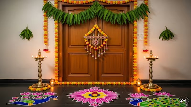 नवरात्रि के दिनों में घर के मुख्य द्वार पर आम या अशोक के पत्तों का तोरण लगाना बेहद शुभ माना जाता है। हिंदू परंपरा में तोरण को मंगल और समृद्धि का प्रतीक माना गया है। मान्यता है कि आम के पत्तों का तोरण लगाने से घर में सकारात्मक ऊर्जा का संचार होता है और नकारात्मक ऊर्जा का प्रवेश रुक जाता है। इसके साथ ही मुख्य द्वार को नियमित रूप से साफ रखना और उसे सजाकर रखना भी जरूरी माना जाता है क्योंकि स्वच्छता को भी शुभता का प्रतीक माना जाता है।