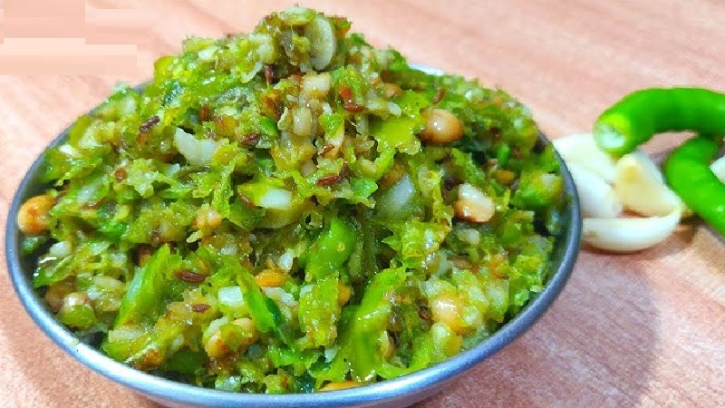 एक पैन में थोड़ा तेल गर्म करें।हरी मिर्च डंठल हटाकर लहसुन की कलियां और मूंगफली डालें।इन्हें तब तक भूनें जब तक मिर्च पर हल्के भूरे धब्बे न आएं और मूंगफली कुरकुरी न हो जाए। थोड़ा जीरा भी डालें। भुनी हुई सामग्री को ओखली में निकालें और स्वादानुसार नमक मिलाएं। इसे दरदरा कूट लें बारीक पेस्ट नहीं बनाना है। इच्छानुसार नींबू का रस या बारीक कटा हरा धनिया डाल सकते हैं।